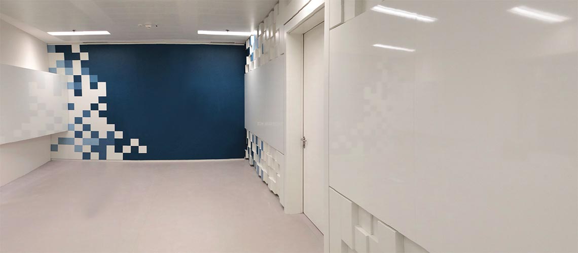 In this obeya I decided to contain the chaotic area where the documents are attached to a central band of magnetic whiteboards and to fill the upper and lower part of the walls with 3D pixel panels inspired by the plant logo.